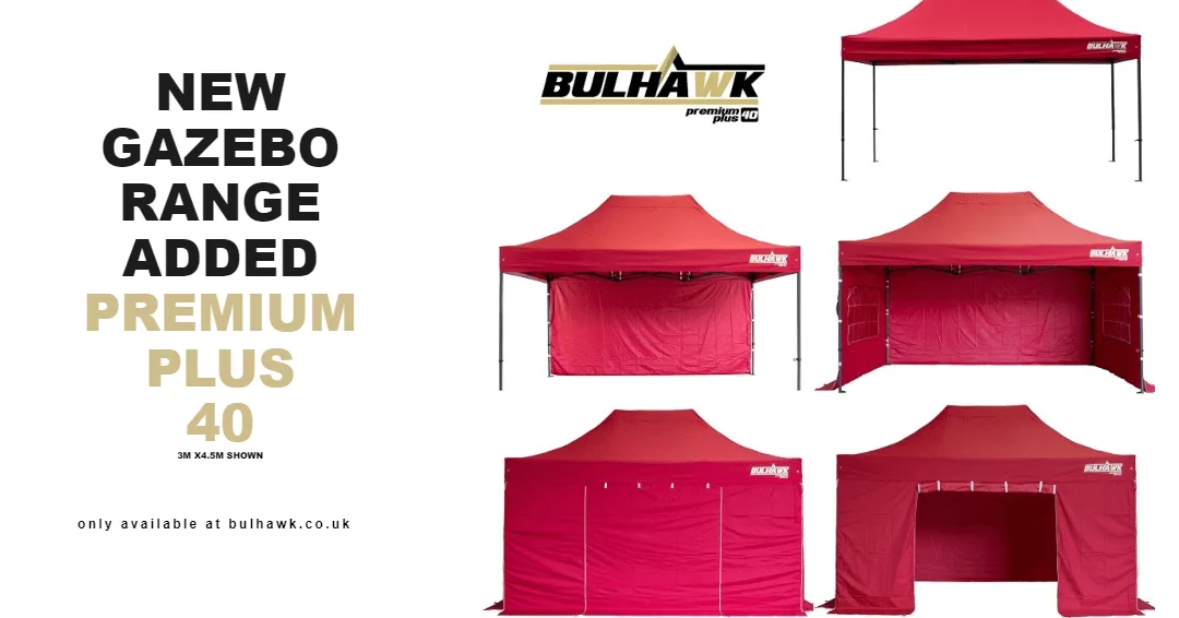 [vc_row][vc_column][vc_tabs position=”top-justify” skin=”dark”][vc_tab title=”Overview” tab_id=”a87537d4-87da-6″][vc_row_inner][vc_column_inner width=”1/2″][vc_single_image image=”3691″ img_size=”medium” alignment=”center”][/vc_column_inner][vc_column_inner width=”1/2″][vc_single_image image=”3690″ img_size=”medium” alignment=”center”][/vc_column_inner][/vc_row_inner][vc_row_inner][vc_column_inner][vc_column_text] Introducing the Bulhawk Premium Plus 3m x 4.5m pop up gazebo. Like all Bulhawk products, this item has been designed and finished to an exceptional standard and is far superior to anything else being sold in this price range. With many gazebo options available on the market, it is very easy to be persuaded to purchase the cheap option as a result of nice images and false promises. However, many of our customers tell us that they are buying from us to replace a cheaper gazebo they purchased, in turn costing them more money overall. Avoid this error and Trust in the Hawk! The Bulhawk premium plus range is the mid-high end product line and comes with many features not included in the standard premium range. [/vc_column_text][/vc_column_inner][/vc_row_inner][/vc_tab][vc_tab title=”Frame” tab_id=”1142d830-a396-8″][vc_row_inner][vc_column_inner width=”1/2″][vc_single_image image=”3701″ img_size=”medium”][/vc_column_inner][vc_column_inner width=”1/2″][vc_column_text]Frame made using 40mm Hexagonal shaped steel and finished in an anthracite grey finish. Easy to use, pull pin adjusters making it quick and easy to erect and take down. These are also used to control the height levels of your structure. Multiple height options available. Reinforced cold resistant joints designed for maximum shock impact. Thick cross support struts providing maximum stability. Large steel plated feet with triple holes.[/vc_column_text][/vc_column_inner][/vc_row_inner][/vc_tab][vc_tab title=”Roof and Sidewalls” tab_id=”1600526424083-2-4″][vc_row_inner][vc_column_inner width=”1/2″][vc_column_text]Both the roof and sidewalls are made using high quality waterproof 300gsm polyester and finished with thick PVC coating on the underside. The roof seams have been heat tape sealed as a further preventative measure. Each stress point area has been reinforced using double layers of material. Each side of roof valance has double fitted canopy straps, designed to keep the roof compact against the frame. Four fitted sidewalls, intricately designed to provide a snug, compact finish. They are connected to each other using heavy duty waterproof zips. Sidewalls consist of 1 roll up entrance, 2 window panels and 1 plain panel. All sidewalls are fully skirted which means they will touch the floor when the gazebo is on its highest height setting. Each sidewall comes with two metal ring attachments at the base for pegs to slip through. This is a design feature to prevent the walls from flailing in the wind. The two window panels come with zip up privacy blinds.[/vc_column_text][/vc_column_inner][vc_column_inner width=”1/2″][vc_single_image image=”3727″ img_size=”medium” alignment=”center”][/vc_column_inner][/vc_row_inner][/vc_tab][vc_tab title=”Other Features” tab_id=”1600526438334-3-0″][vc_row_inner][vc_column_inner width=”1/2″][vc_column_text]High quality wheeled bag with multiple storage compartments. Multiple pegs provided with guy rope.[/vc_column_text][/vc_column_inner][vc_column_inner width=”1/2″][vc_single_image image=”3700″ img_size=”medium”][/vc_column_inner][/vc_row_inner][/vc_tab][/vc_tabs][/vc_column][/vc_row]