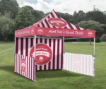 All printed works are produced on to a high quality 600D polyester which compliments the vibrancy and finish of all of the design works. Our roof covers also included a heat tape sealing along all of the connecting stitch lines for full weatherproofing. Each of the stress areas are reinforced with additional fabric layers to prevent damage from friction. All sides of the roof cover include canopy straps to fully secure to the frame. The underside of the roof cover also comes with a thick heavy duty velcro strip as standard to allow for sidewalls to be connected if required. The fabric is fully fire retardant to BS7837 with certification available if required.