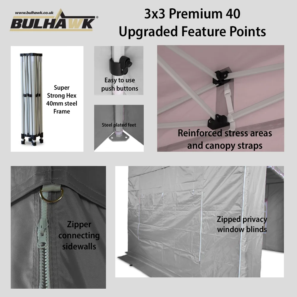 Bulhawk® 3m x 3m Premium Hex 40 Steel Heavy Duty Pop Up Gazebo